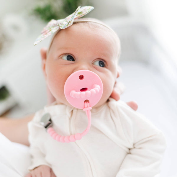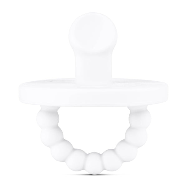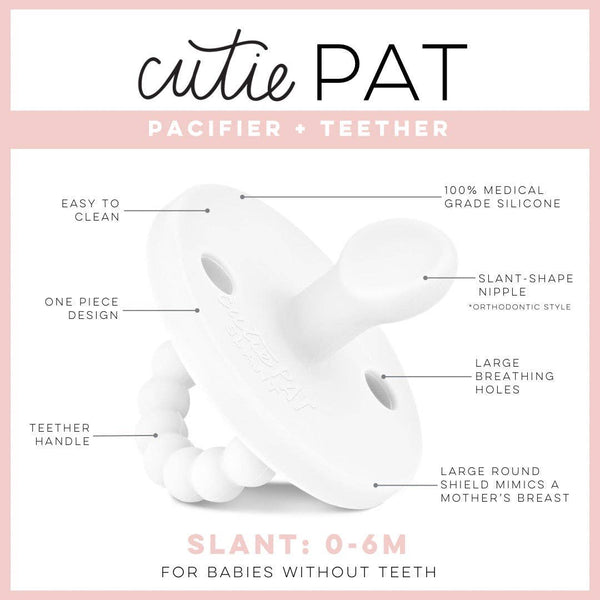 The Cutie PAT (Pacifier And Teether) is a multifunctional 2-in-1 patented design. The nipple was created to soothe, while the teether was developed to aid in teething relief. The Cutie PAT is a safe, one-piece design made out of 100% medical-grade silicone. It has a large round shield for teething, and large holes for safe breathing. The teether handle provides comfort for sore gums, and also makes it easy for baby to hold and place in their mouth.