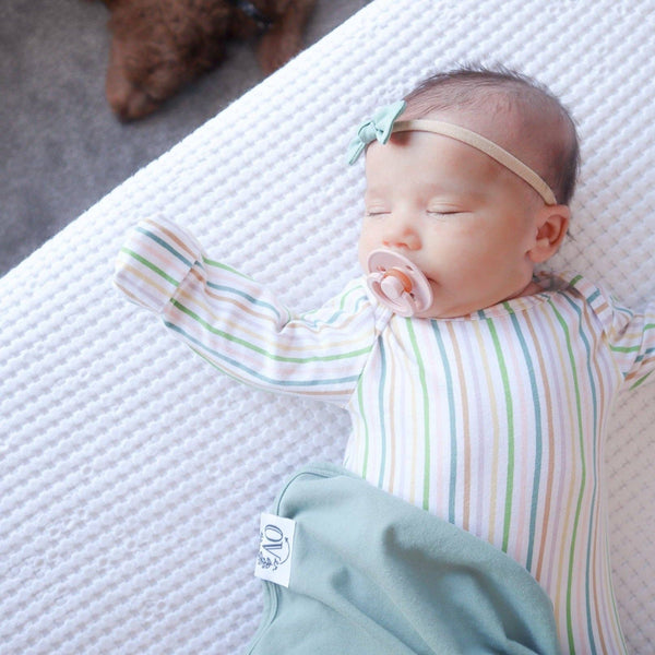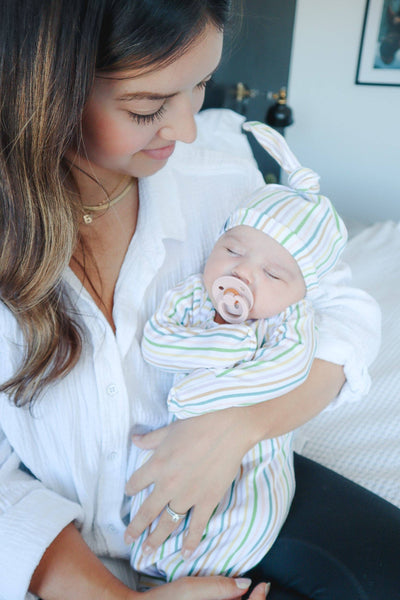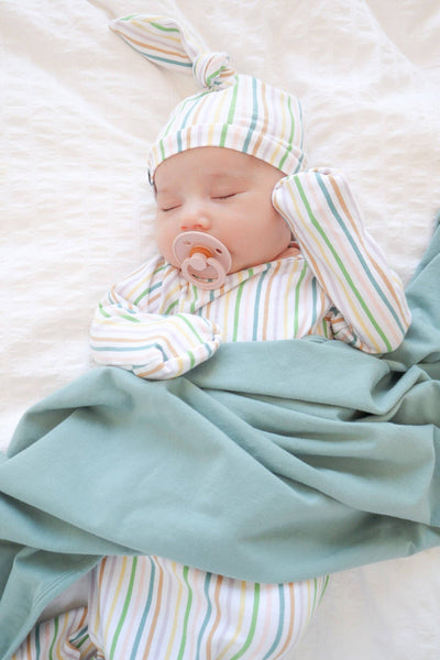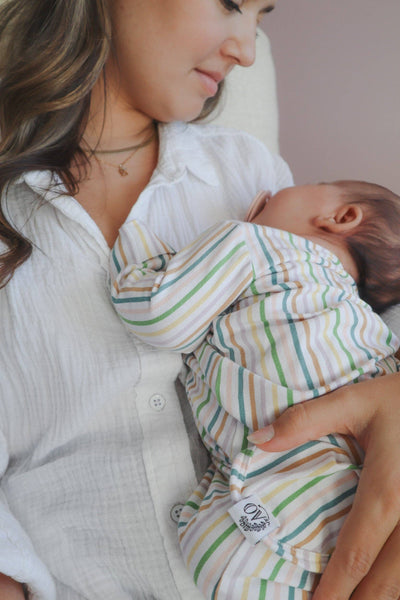 The OVer Company’s nodo gown is a modern baby must-have that is both stylish and practical. The cutest coming home outfit, photoshoot outfit, or baby gift, the nodo gown is at the top of every parent’s wish list! Ethically made from our high-quality natural cotton blend, the nodo gown is buttery soft, breathable, and has the perfect stretch. Late-night diaper changes are made easy with the quick tie bottom, keeping baby warm on top. The lap neck top makes it easy to dress the baby from the feet up, keeping the baby’s sensitive head safe. Convenient fold-over cuffs keep little hands warm and protect babe from scratching. The nodo gown is adorable when paired with a coordinating nodo hat, Butter Blankets, or OVer cover!
