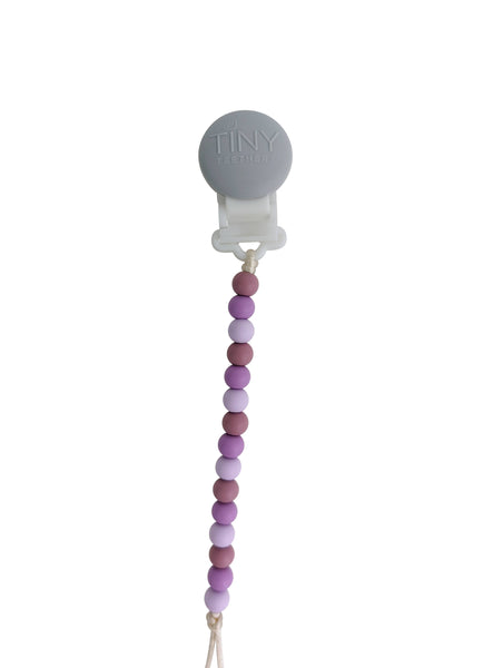 Our innovative silicone clip is designed with few moving parts and no metal. This allows them to teethe on the clip itself, unlike the wood or metal ones.